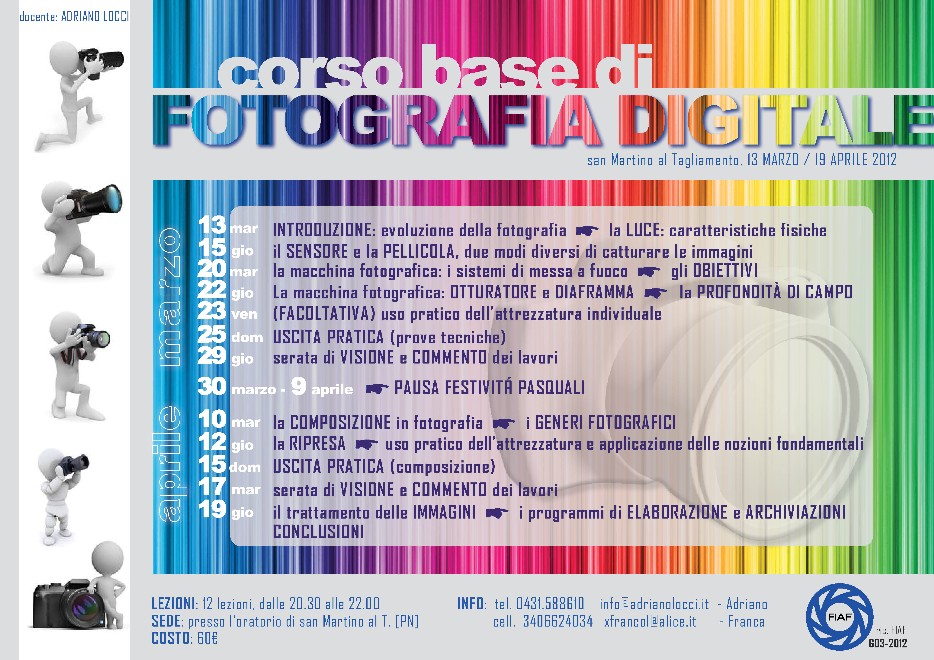 Il corso della durata di 12 ( dodici ) lezioni per un totale di 24 ore,si svolgerà presso la sede del circolo a Rive d’Arcano dalle ore 20.00. é necessario essere in possesso di un computer portatile e di chiavetta per Internet. Il costo del corso è di 100 (cento) euro, da versare al momento della conferma.